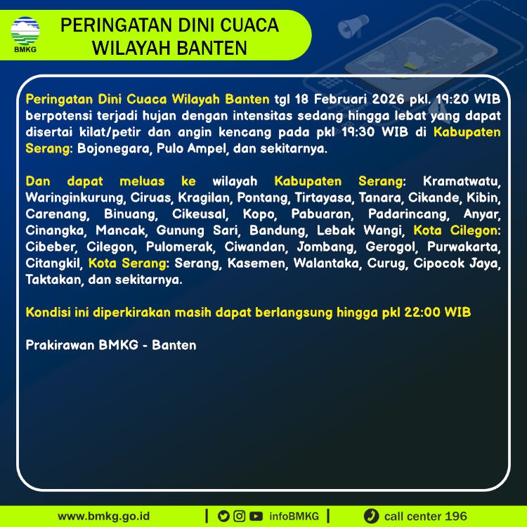 Peringatan Dini Cuaca Banten tgl 18 Februari 2026 pkl 19:20 WIB berpotensi terjadi Hujan Sedang-Lebat yang dapat disertai Kilat/Petir dan Angin Kencang pada pkl. 19:30 WIB di