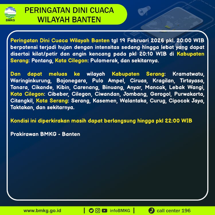Peringatan Dini Cuaca Banten tgl 19 Februari 2026 pkl 20:00 WIB masih berpotensi terjadi Hujan Sedang-Lebat yang dapat disertai Kilat/Petir dan Angin Kencang pada pkl. 20:10 WIB di