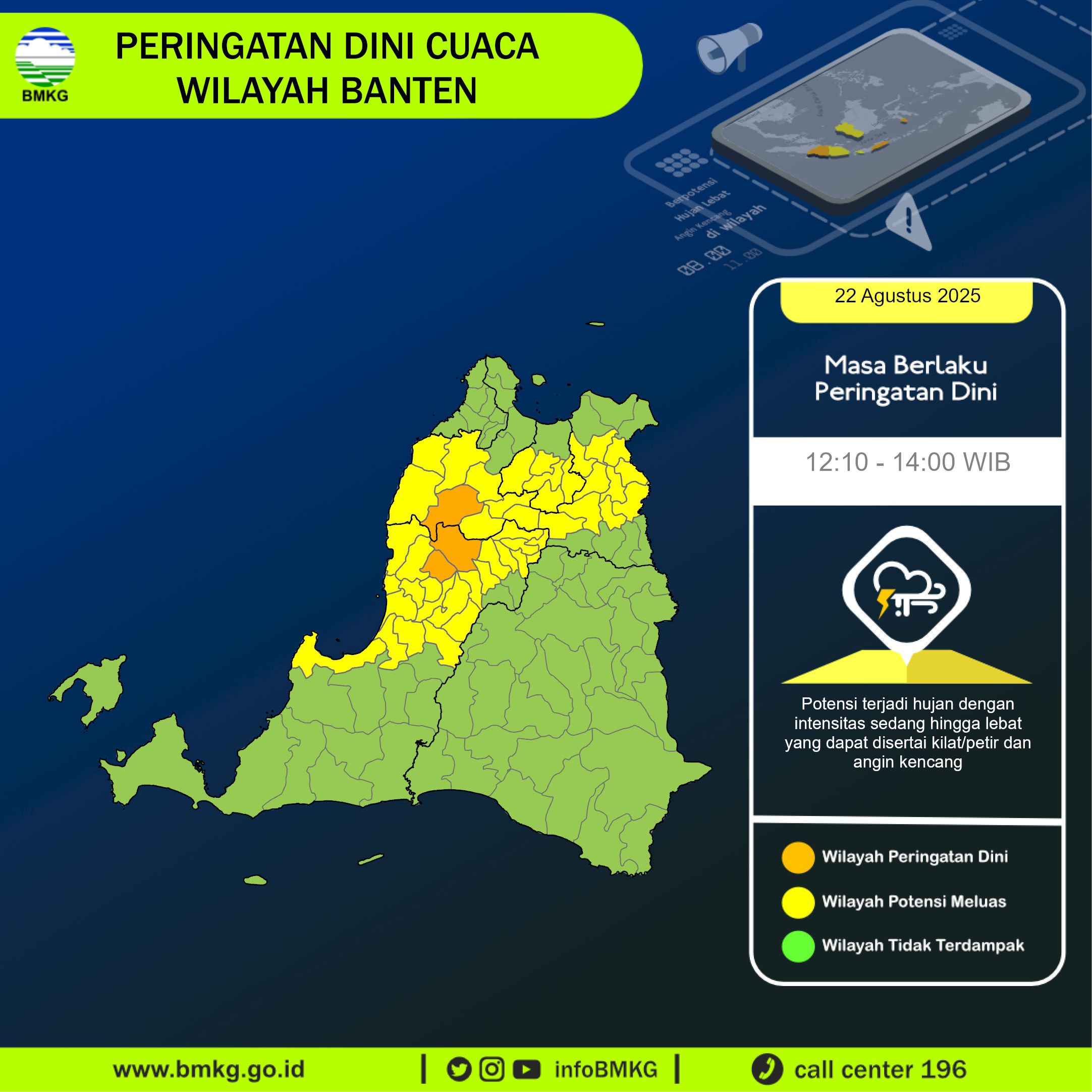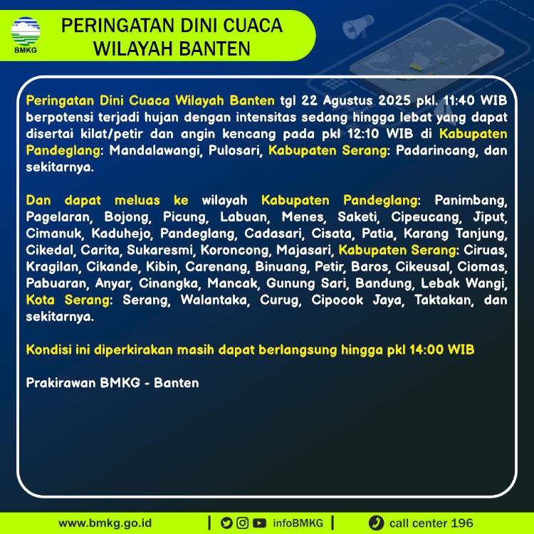 Peringatan Dini Cuaca Banten tgl 22 Agustus 2025 pkl 11:40 WIB berpotensi terjadi Hujan Sedang-Lebat yang dapat disertai Kilat/Petir dan Angin Kencang pada pkl. 12:10 WIB di