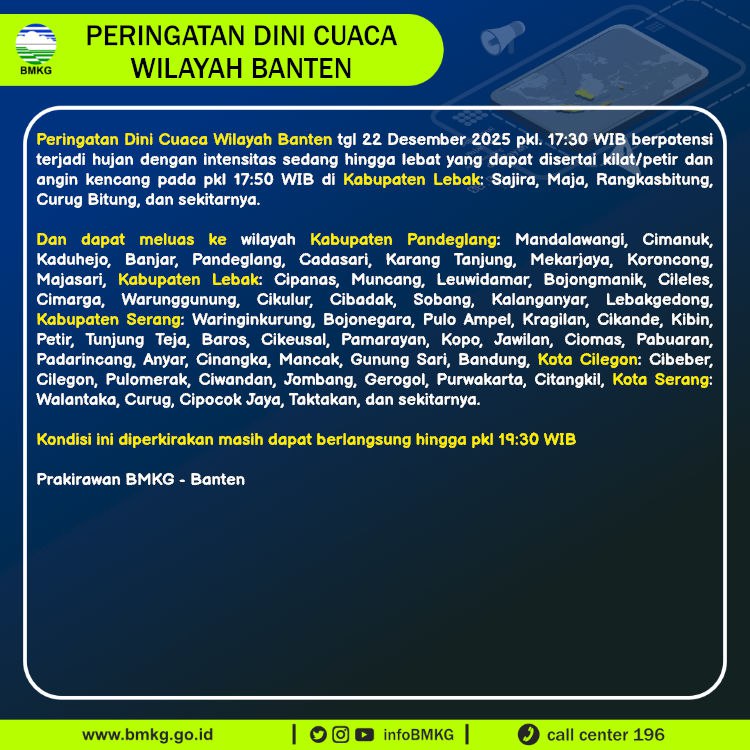 Peringatan Dini Cuaca Banten tgl 22 Desember 2025 pkl 17:30 WIB berpotensi terjadi Hujan Sedang-Lebat yang dapat disertai Kilat/Petir dan Angin Kencang pada pkl. 17:50 WIB di