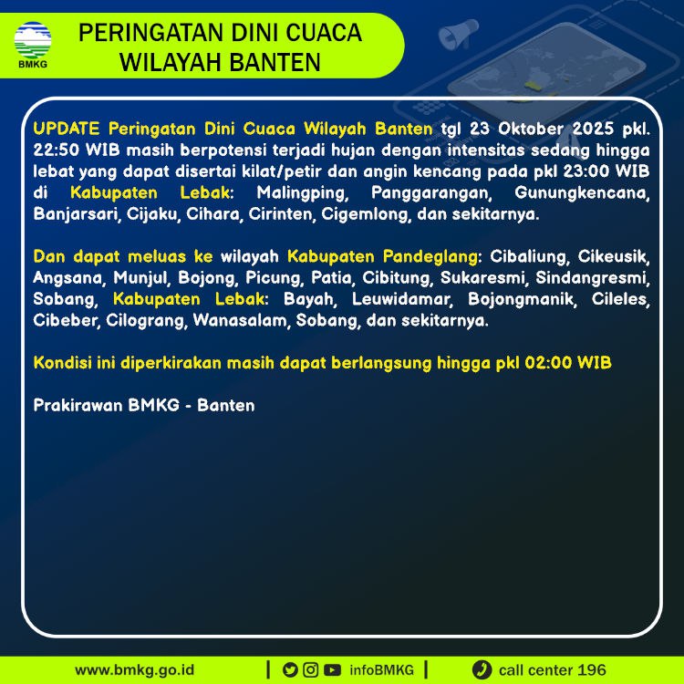 Peringatan Dini Cuaca Banten tgl 23 Oktober 2025 pkl 22:50 WIB masih berpotensi terjadi Hujan Sedang-Lebat yang dapat disertai Kilat/Petir dan Angin Kencang pada pkl. 23:00 WIB di
