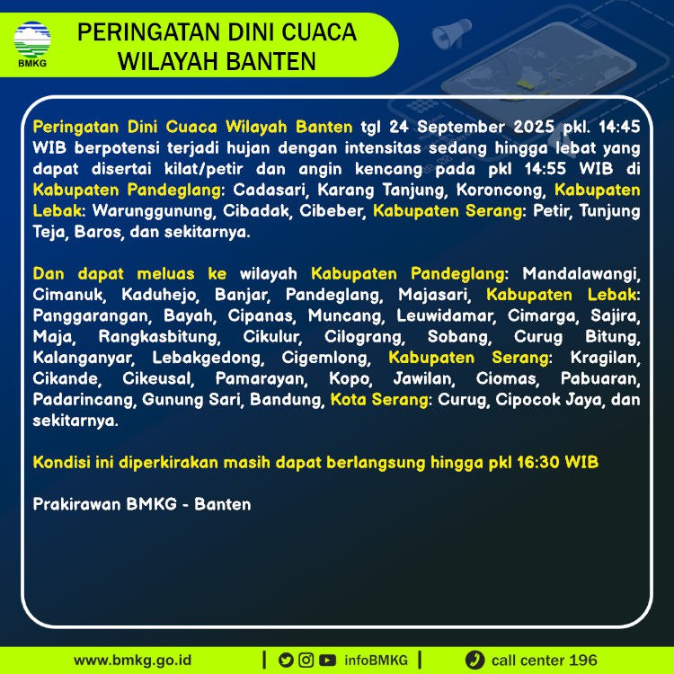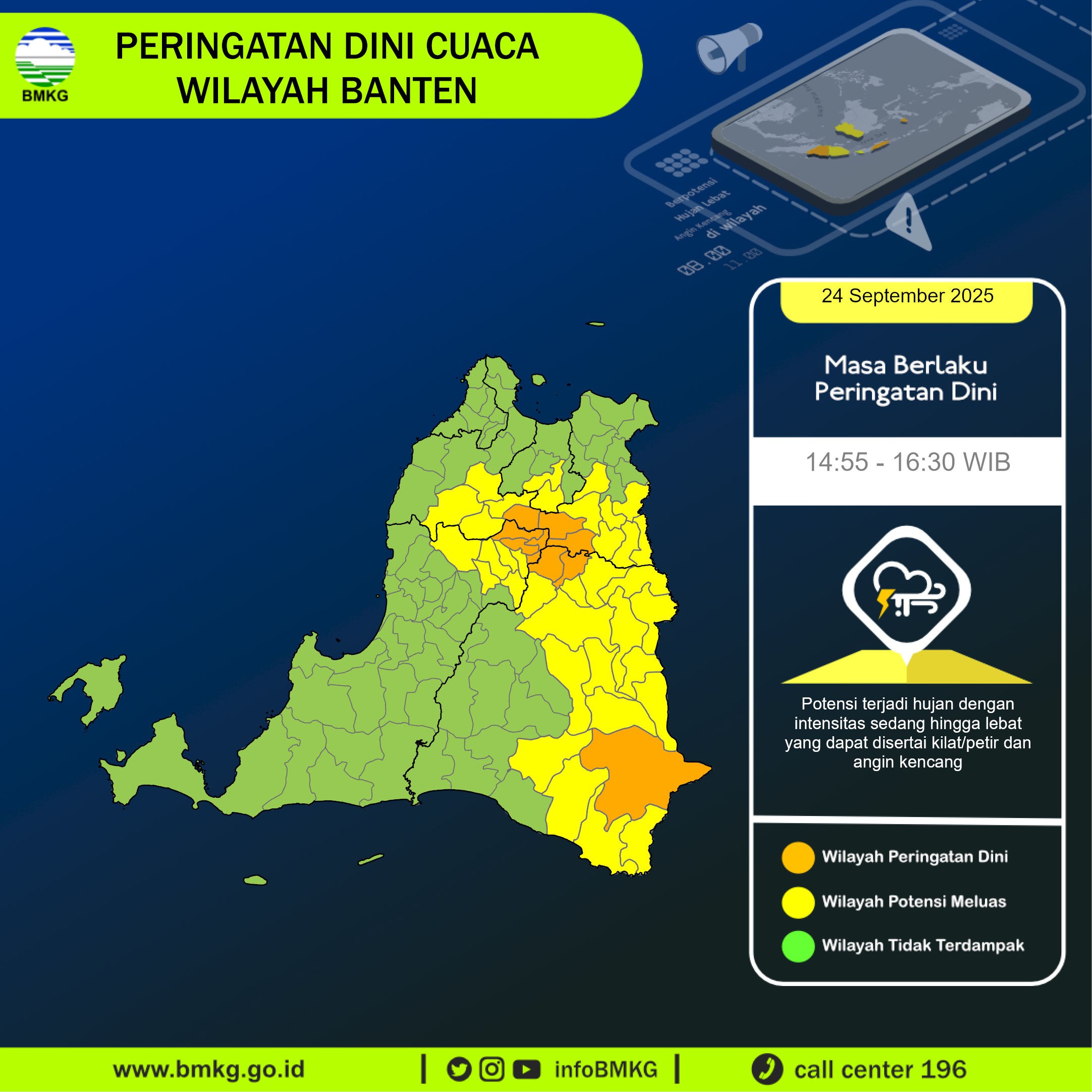 Peringatan Dini Cuaca Banten tgl 24 September 2025 pkl 14:45 WIB berpotensi terjadi Hujan Sedang-Lebat yang dapat disertai Kilat/Petir dan Angin Kencang pada pkl. 14:55 WIB di