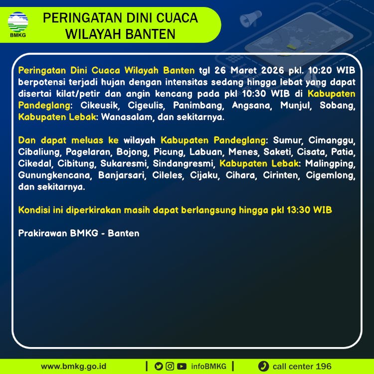 Peringatan Dini Cuaca Banten tgl 26 Maret 2026 pkl 10:20 WIB berpotensi terjadi Hujan Sedang-Lebat yang dapat disertai Kilat/Petir dan Angin Kencang pada pkl. 10:30 WIB di