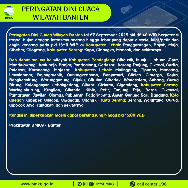Peringatan Dini Cuaca Banten tgl 27 September 2025 pkl 12:40 WIB berpotensi terjadi Hujan Sedang-Lebat yang dapat disertai Kilat/Petir dan Angin Kencang pada pkl. 13:10 WIB di