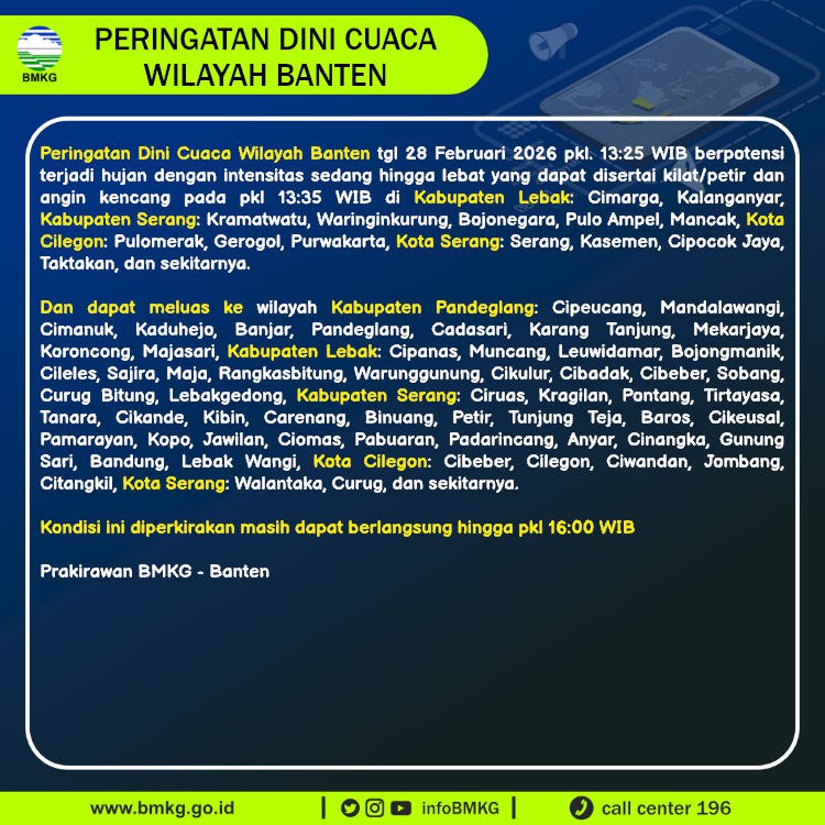 Peringatan Dini Cuaca Banten tgl 28 Februari 2026 pkl 13:25 WIB berpotensi terjadi Hujan Sedang-Lebat yang dapat disertai Kilat/Petir dan Angin Kencang pada pkl. 13:35 WIB di