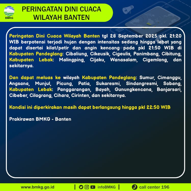 Peringatan Dini Cuaca Banten tgl 28 September 2025 pkl 21:20 WIB berpotensi terjadi Hujan Sedang-Lebat yang dapat disertai Kilat/Petir dan Angin Kencang pada pkl. 21:50 WIB di