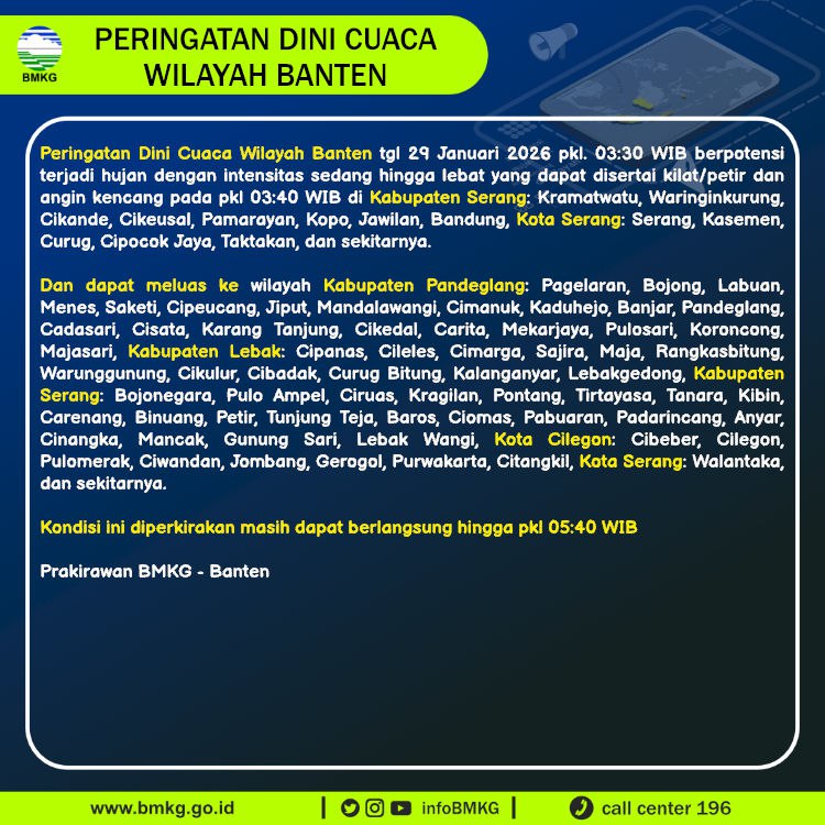 Peringatan Dini Cuaca Banten tgl 29 Januari 2026 pkl 03:30 WIB berpotensi terjadi Hujan Sedang-Lebat yang dapat disertai Kilat/Petir dan Angin Kencang pada pkl. 03:40 WIB di