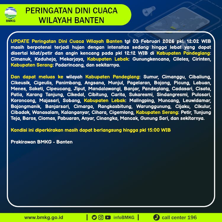Peringatan Dini Cuaca Banten tgl 3 Februari 2026 pkl 12:02 WIB masih berpotensi terjadi Hujan Sedang-Lebat yang dapat disertai Kilat/Petir dan Angin Kencang pada pkl. 12:12 WIB di