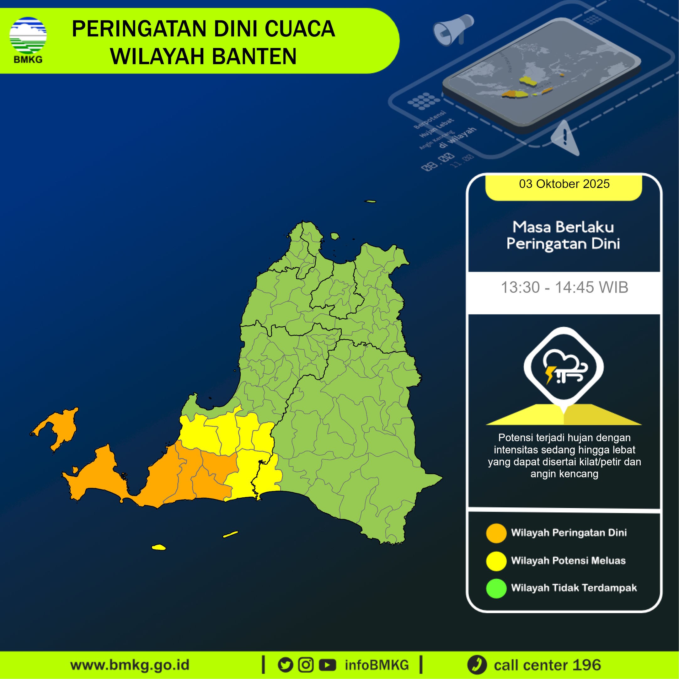 Peringatan Dini Cuaca Banten tgl 3 Oktober 2025 pkl 13:20 WIB berpotensi terjadi Hujan Sedang-Lebat yang dapat disertai Kilat/Petir dan Angin Kencang pada pkl. 13:30 WIB di