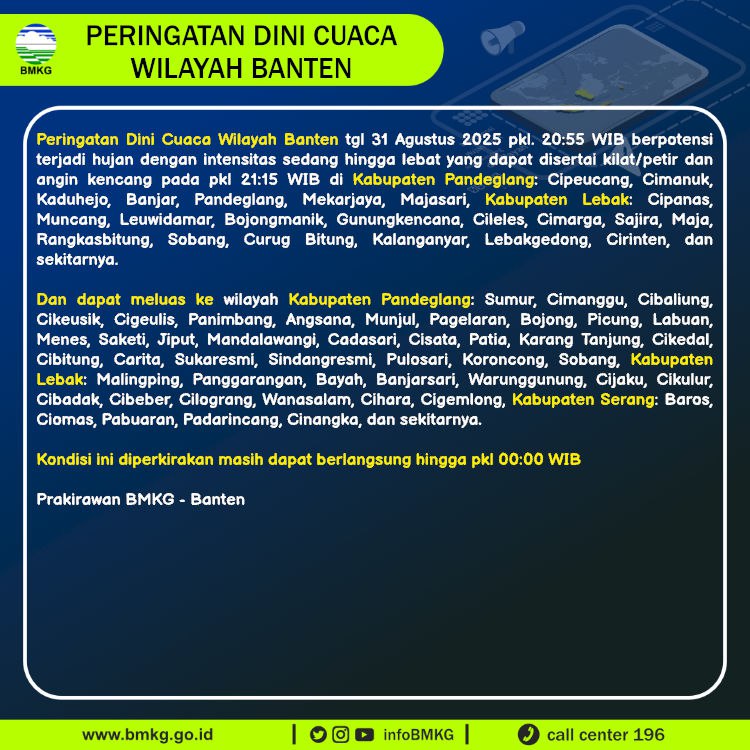 Peringatan Dini Cuaca Banten tgl 31 Agustus 2025 pkl 20:55 WIB berpotensi terjadi Hujan Sedang-Lebat yang dapat disertai Kilat/Petir dan Angin Kencang pada pkl. 21:15 WIB di