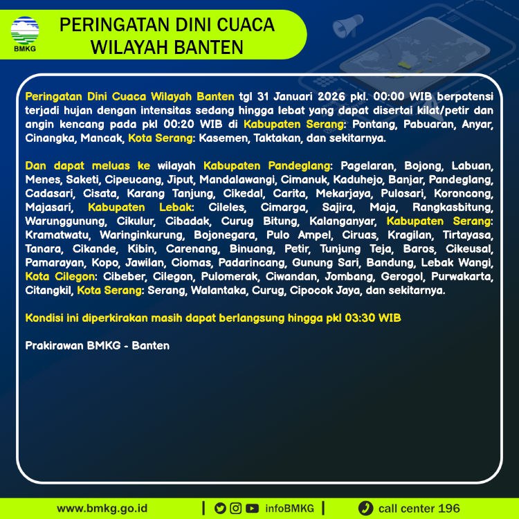 Peringatan Dini Cuaca Banten tgl 31 Januari 2026 pkl 00:00 WIB berpotensi terjadi Hujan Sedang-Lebat yang dapat disertai Kilat/Petir dan Angin Kencang pada pkl. 00:20 WIB di