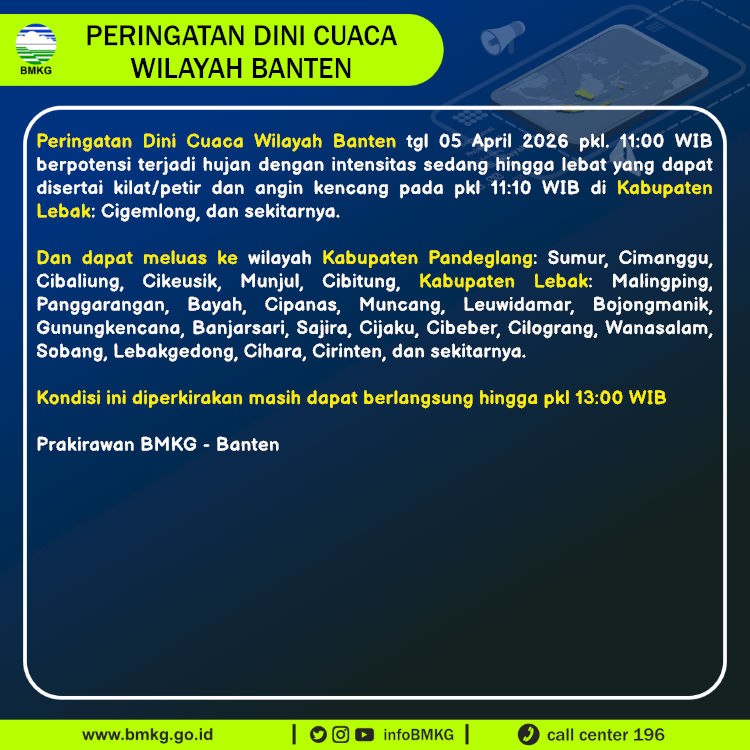 Peringatan Dini Cuaca Banten tgl 5 April 2026 pkl 11:00 WIB berpotensi terjadi Hujan Sedang-Lebat yang dapat disertai Kilat/Petir dan Angin Kencang pada pkl. 11:10 WIB di