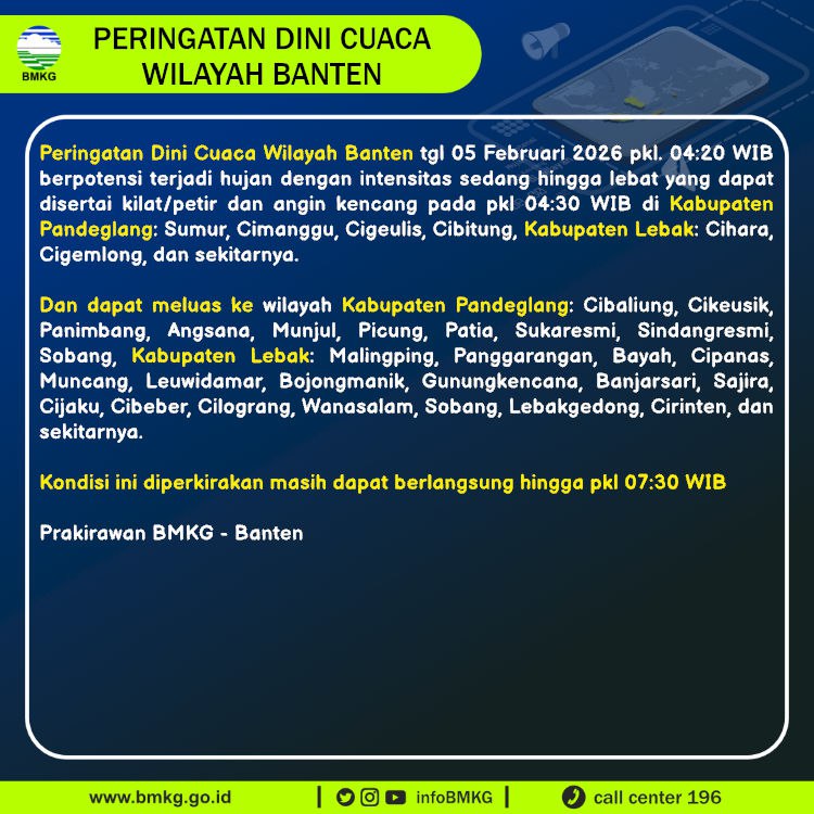 Peringatan Dini Cuaca Banten tgl 5 Februari 2026 pkl 04:20 WIB berpotensi terjadi Hujan Sedang-Lebat yang dapat disertai Kilat/Petir dan Angin Kencang pada pkl. 04:30 WIB di