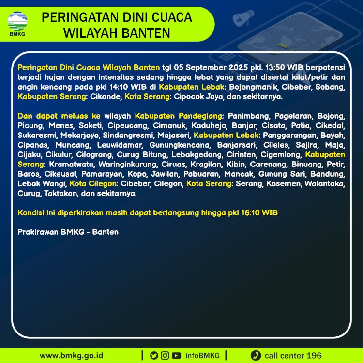 Peringatan Dini Cuaca Banten tgl 5 September 2025 pkl 13:50 WIB berpotensi terjadi Hujan Sedang-Lebat yang dapat disertai Kilat/Petir dan Angin Kencang pada pkl. 14:10 WIB di