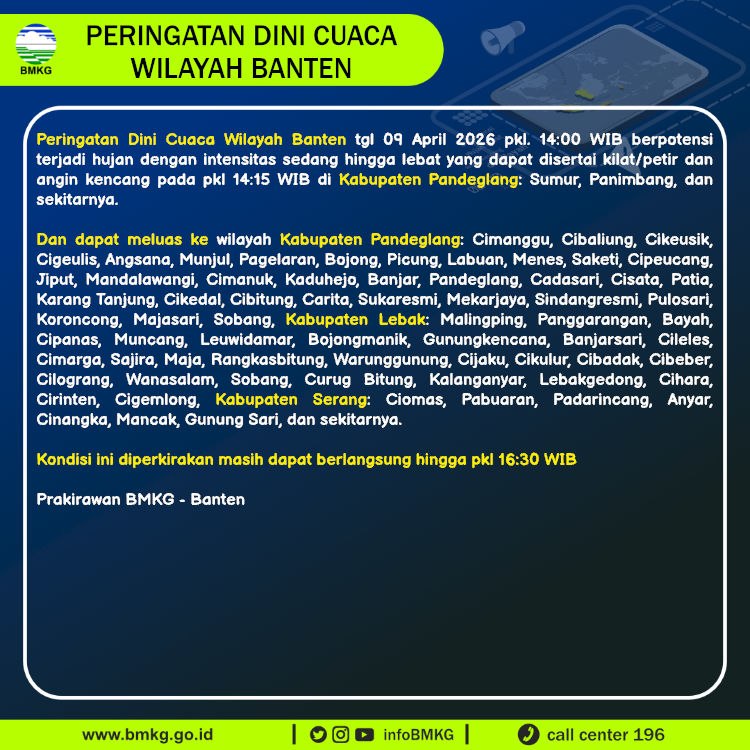 Peringatan Dini Cuaca Banten tgl 9 April 2026 pkl 14:00 WIB berpotensi terjadi Hujan Sedang-Lebat yang dapat disertai Kilat/Petir dan Angin Kencang pada pkl. 14:15 WIB di