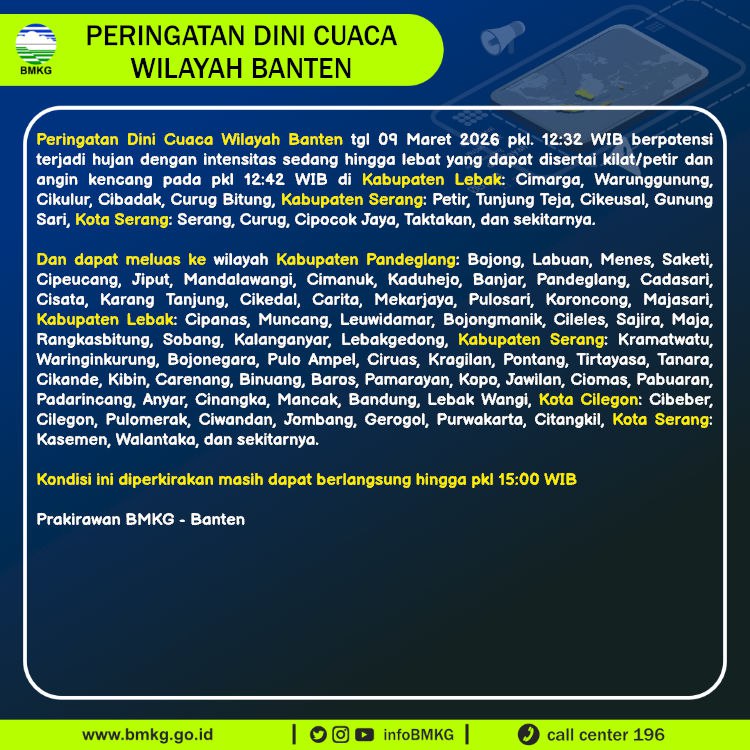 Peringatan Dini Cuaca Banten tgl 9 Maret 2026 pkl 12:32 WIB berpotensi terjadi Hujan Sedang-Lebat yang dapat disertai Kilat/Petir dan Angin Kencang pada pkl. 12:42 WIB di