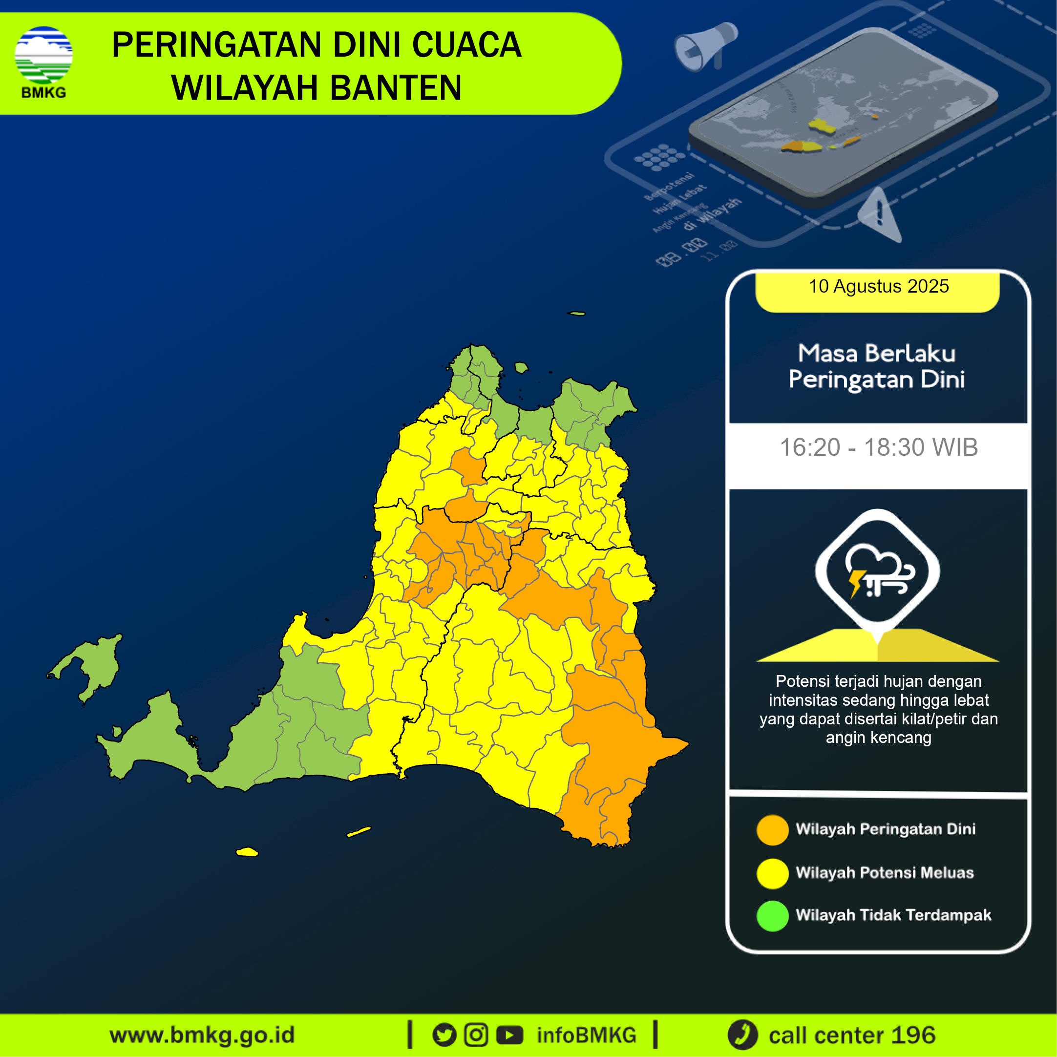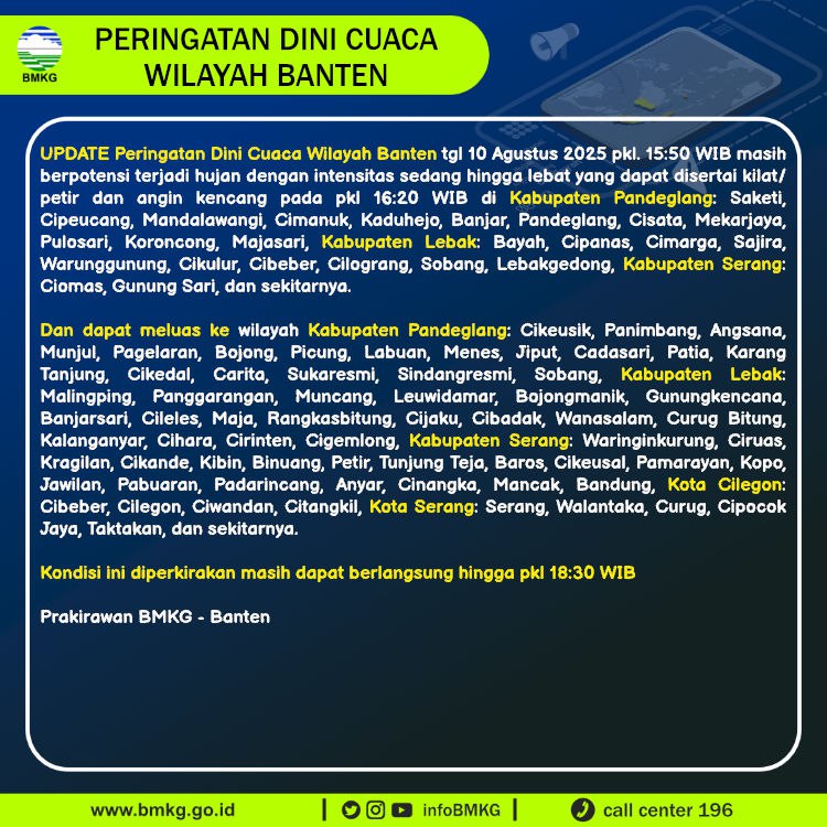 UPDATE Peringatan Dini Cuaca Banten tgl 10 Agustus 2025 pkl 15:50 WIB masih berpotensi terjadi Hujan Sedang-Lebat yang dapat disertai Kilat/Petir dan Angin Kencang pada pkl. 16:20 WIB di