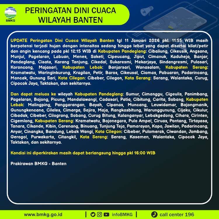 UPDATE Peringatan Dini Cuaca Banten tgl 11 Januari 2026 pkl 11:55 WIB masih berpotensi terjadi Hujan Sedang-Lebat yang dapat disertai Kilat/Petir dan Angin Kencang pada pkl. 12:15 WIB di