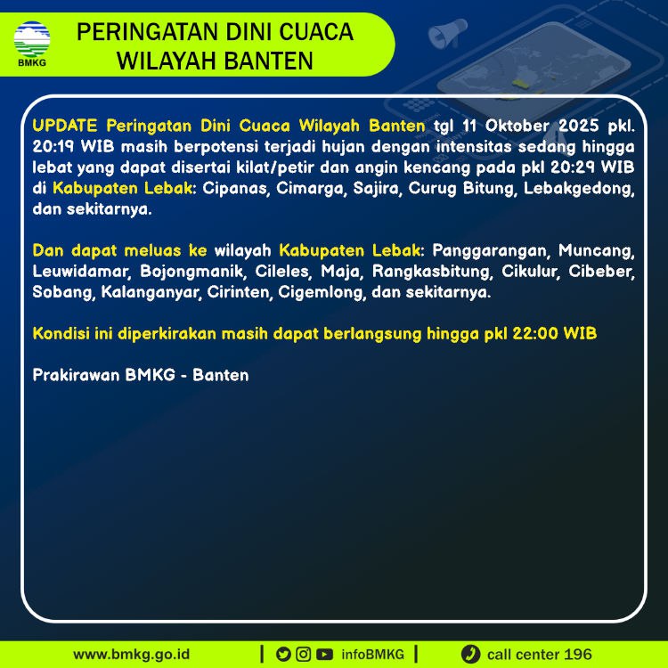 UPDATE Peringatan Dini Cuaca Banten tgl 11 Oktober 2025 pkl 20:19 WIB masih berpotensi terjadi Hujan Sedang-Lebat yang dapat disertai Kilat/Petir dan Angin Kencang pada pkl. 20:29 WIB di
