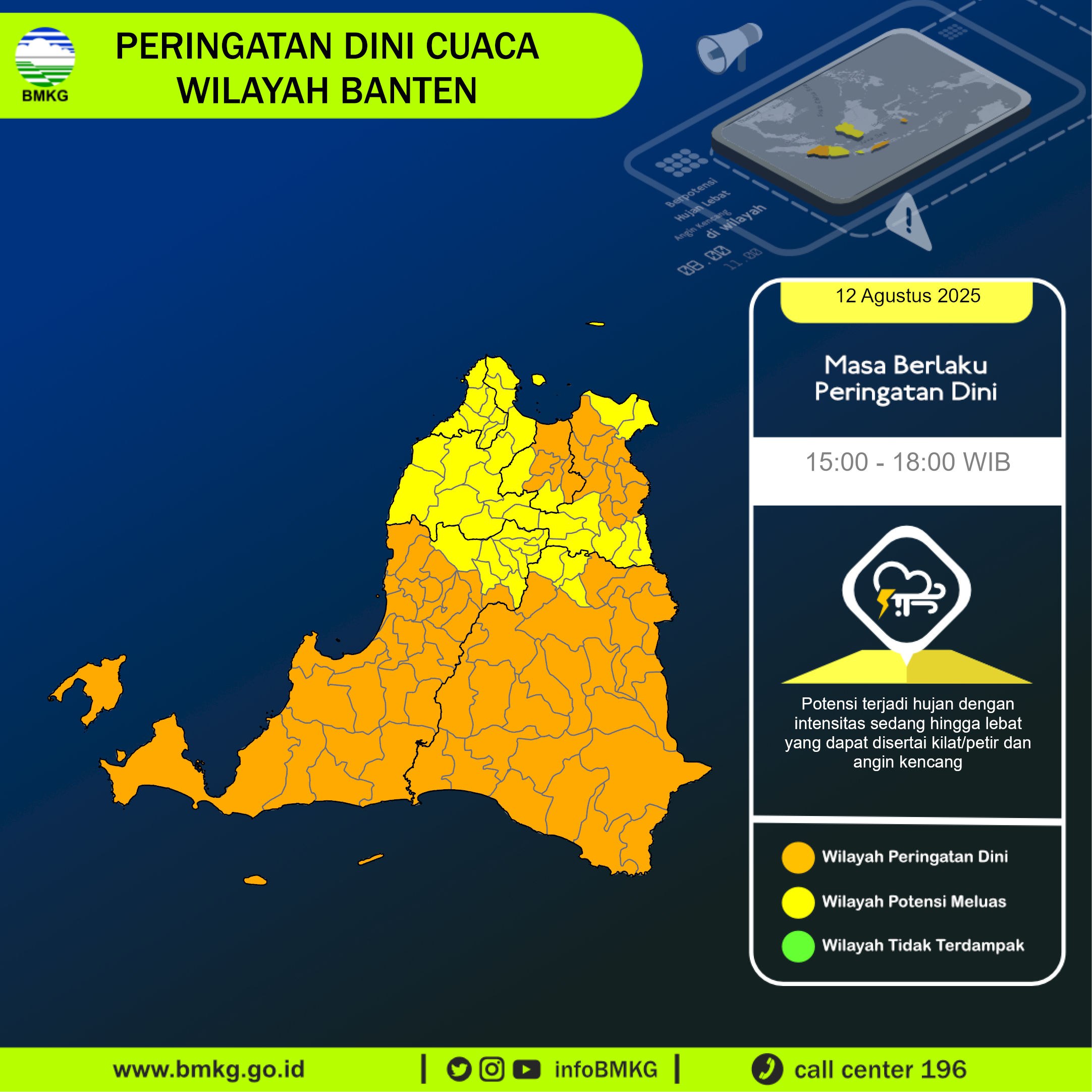 UPDATE Peringatan Dini Cuaca Banten tgl 12 Agustus 2025 pkl 14:30 WIB masih berpotensi terjadi Hujan Sedang-Lebat yang dapat disertai Kilat/Petir dan Angin Kencang pada pkl. 15:00 WIB di