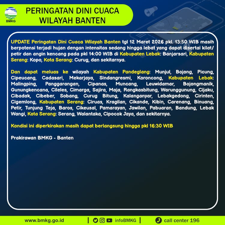 UPDATE Peringatan Dini Cuaca Banten tgl 12 Maret 2026 pkl 13:50 WIB masih berpotensi terjadi Hujan Sedang-Lebat yang dapat disertai Kilat/Petir dan Angin Kencang pada pkl. 14:00 WIB di