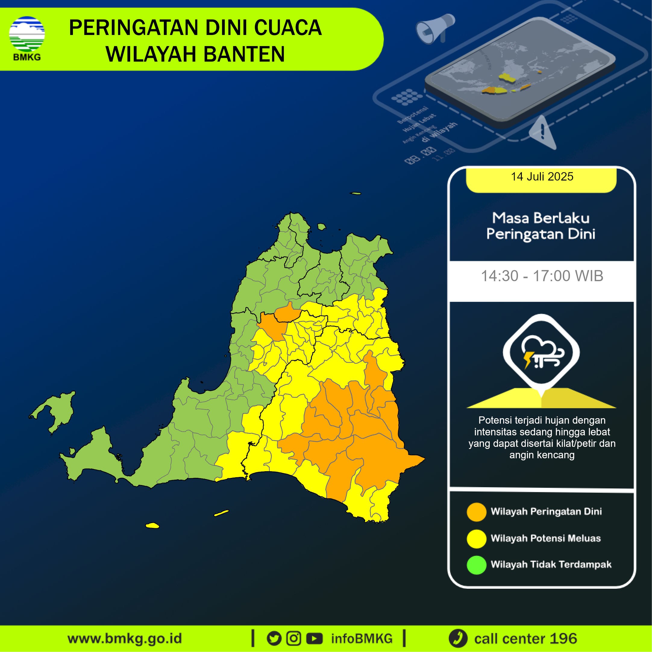 UPDATE Peringatan Dini Cuaca Banten tgl 14 Juli 2025 pkl 14:00 WIB masih berpotensi terjadi Hujan Sedang-Lebat yang dapat disertai Kilat/Petir dan Angin Kencang pada pkl. 14:30 WIB di