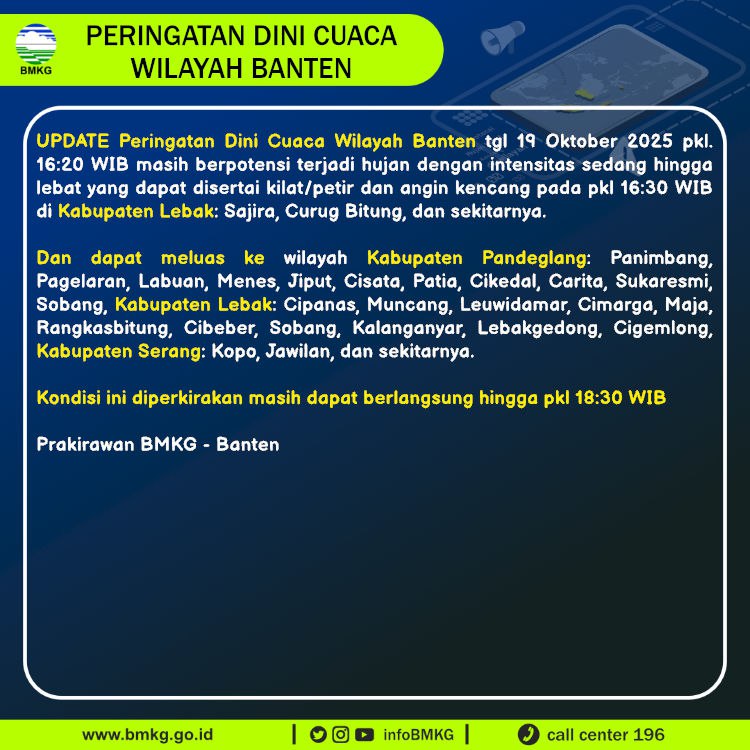 UPDATE Peringatan Dini Cuaca Banten tgl 19 Oktober 2025 pkl 16:20 WIB masih berpotensi terjadi Hujan Sedang-Lebat yang dapat disertai Kilat/Petir dan Angin Kencang pada pkl. 16:30 WIB di