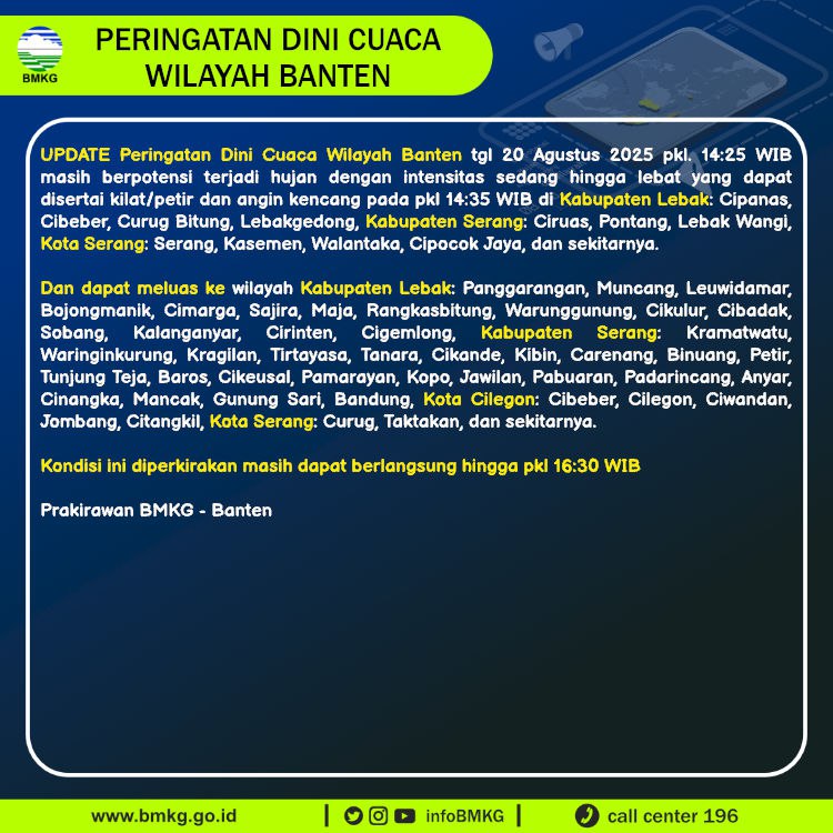 UPDATE Peringatan Dini Cuaca Banten tgl 20 Agustus 2025 pkl 14:25 WIB masih berpotensi terjadi Hujan Sedang-Lebat yang dapat disertai Kilat/Petir dan Angin Kencang pada pkl. 14:35 WIB di