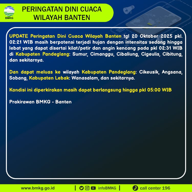 UPDATE Peringatan Dini Cuaca Banten tgl 20 Oktober 2025 pkl 02:21 WIB masih berpotensi terjadi Hujan Sedang-Lebat yang dapat disertai Kilat/Petir dan Angin Kencang pada pkl. 02:31 WIB di