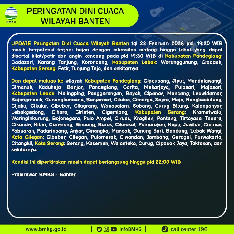 UPDATE Peringatan Dini Cuaca Banten tgl 22 Februari 2026 pkl 19:20 WIB masih berpotensi terjadi Hujan Sedang-Lebat yang dapat disertai Kilat/Petir dan Angin Kencang pada pkl. 19:30 WIB di