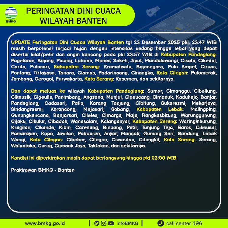 UPDATE Peringatan Dini Cuaca Banten tgl 23 Desember 2025 pkl 23:47 WIB masih berpotensi terjadi Hujan Sedang-Lebat yang dapat disertai Kilat/Petir dan Angin Kencang pada pkl. 23:57 WIB di