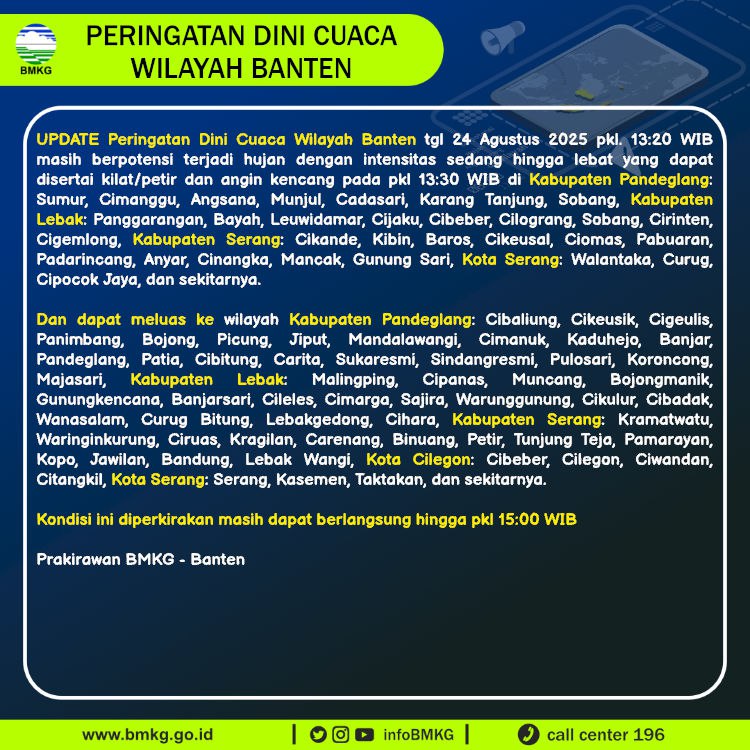 UPDATE Peringatan Dini Cuaca Banten tgl 24 Agustus 2025 pkl 13:20 WIB masih berpotensi terjadi Hujan Sedang-Lebat yang dapat disertai Kilat/Petir dan Angin Kencang pada pkl. 13:30 WIB di