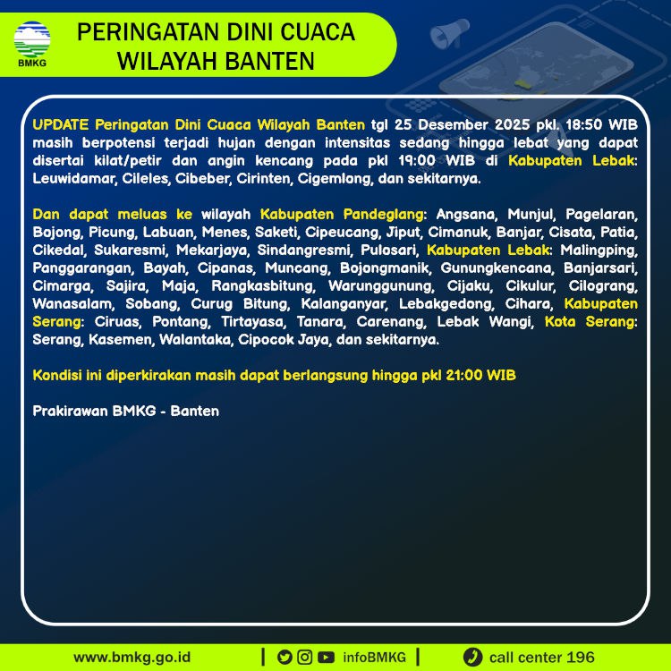 UPDATE Peringatan Dini Cuaca Banten tgl 25 Desember 2025 pkl 18:50 WIB masih berpotensi terjadi Hujan Sedang-Lebat yang dapat disertai Kilat/Petir dan Angin Kencang pada pkl. 19:00 WIB di