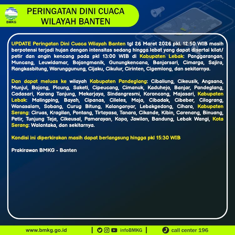 UPDATE Peringatan Dini Cuaca Banten tgl 26 Maret 2026 pkl 12:50 WIB masih berpotensi terjadi Hujan Sedang-Lebat yang dapat disertai Kilat/Petir dan Angin Kencang pada pkl. 13:00 WIB di
