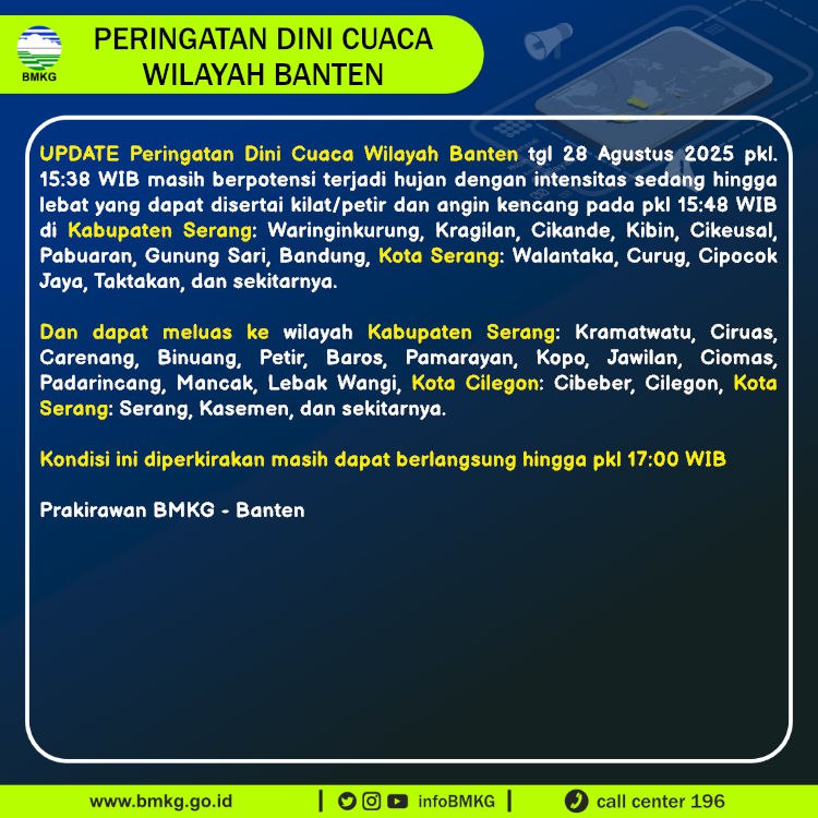 UPDATE Peringatan Dini Cuaca Banten tgl 28 Agustus 2025 pkl 15:38 WIB masih berpotensi terjadi Hujan Sedang-Lebat yang dapat disertai Kilat/Petir dan Angin Kencang pada pkl. 15:48 WIB di