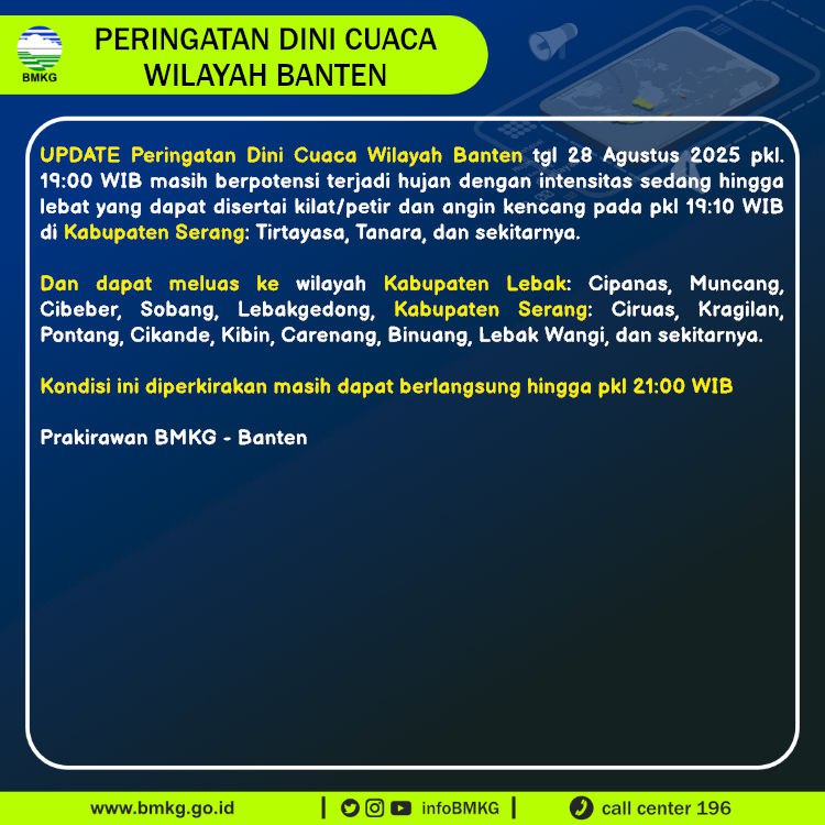 UPDATE Peringatan Dini Cuaca Banten tgl 28 Agustus 2025 pkl 19:00 WIB masih berpotensi terjadi Hujan Sedang-Lebat yang dapat disertai Kilat/Petir dan Angin Kencang pada pkl. 19:10 WIB di