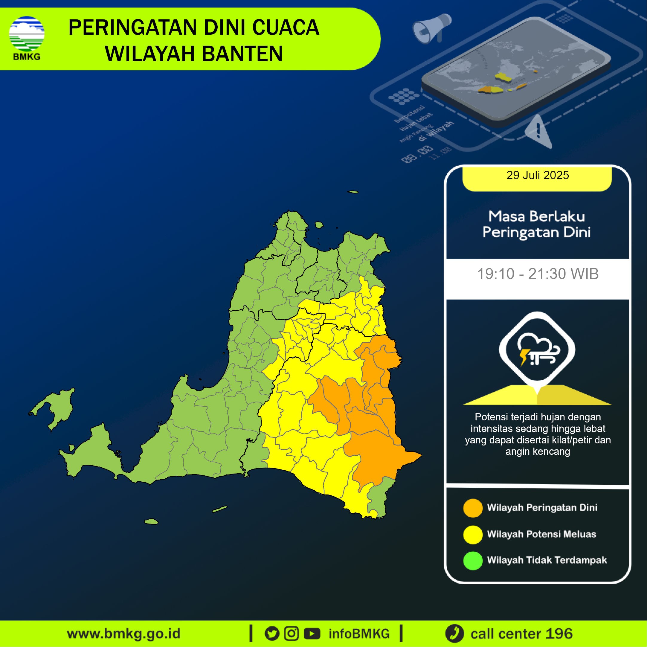 UPDATE Peringatan Dini Cuaca Banten tgl 29 Juli 2025 pkl 18:54 WIB masih berpotensi terjadi Hujan Sedang-Lebat yang dapat disertai Kilat/Petir dan Angin Kencang pada pkl. 19:10 WIB di