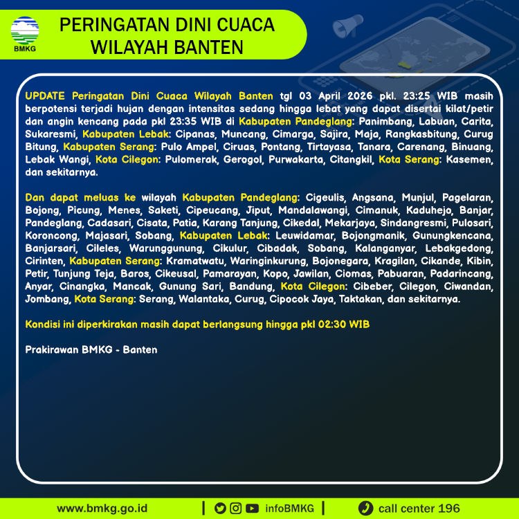 UPDATE Peringatan Dini Cuaca Banten tgl 3 April 2026 pkl 23:25 WIB masih berpotensi terjadi Hujan Sedang-Lebat yang dapat disertai Kilat/Petir dan Angin Kencang pada pkl. 23:35 WIB di