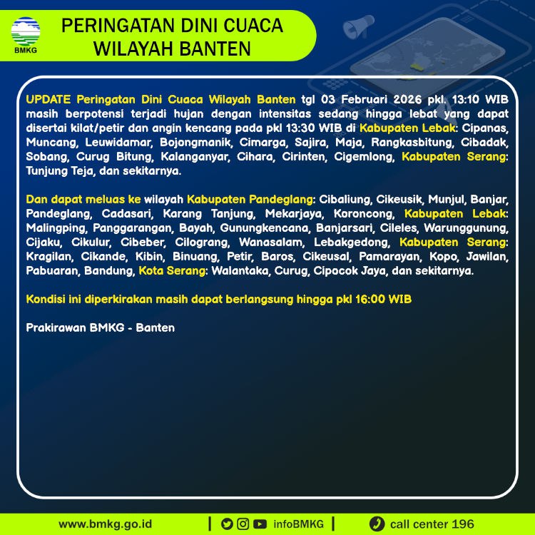 UPDATE Peringatan Dini Cuaca Banten tgl 3 Februari 2026 pkl 13:10 WIB masih berpotensi terjadi Hujan Sedang-Lebat yang dapat disertai Kilat/Petir dan Angin Kencang pada pkl. 13:30 WIB di