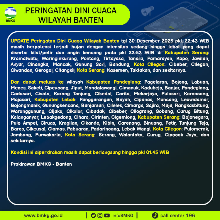 UPDATE Peringatan Dini Cuaca Banten tgl 30 Desember 2025 pkl 22:43 WIB masih berpotensi terjadi Hujan Sedang-Lebat yang dapat disertai Kilat/Petir dan Angin Kencang pada pkl. 22:53 WIB di
