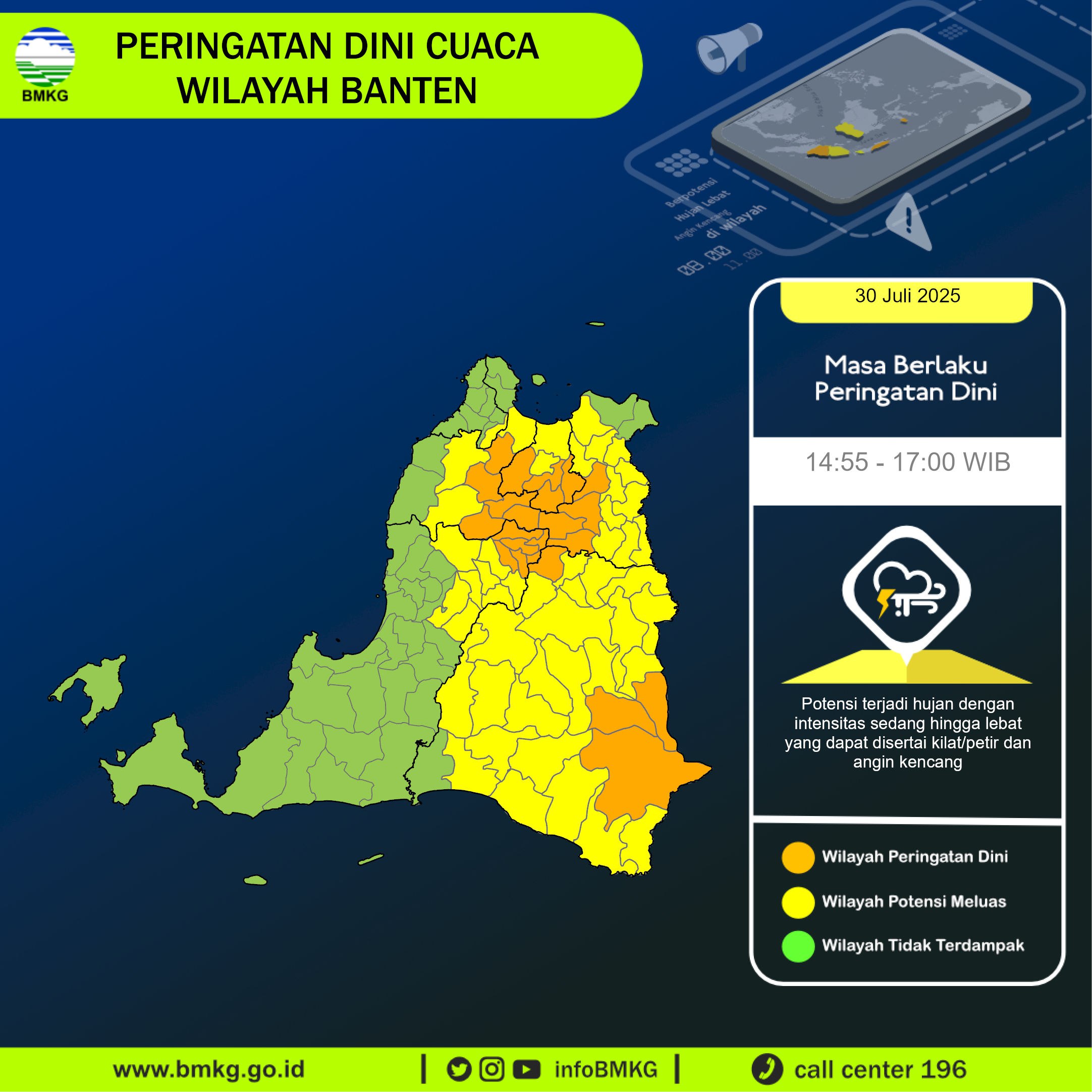 UPDATE Peringatan Dini Cuaca Banten tgl 30 Juli 2025 pkl 14:45 WIB masih berpotensi terjadi Hujan Sedang-Lebat yang dapat disertai Kilat/Petir dan Angin Kencang pada pkl. 14:55 WIB di