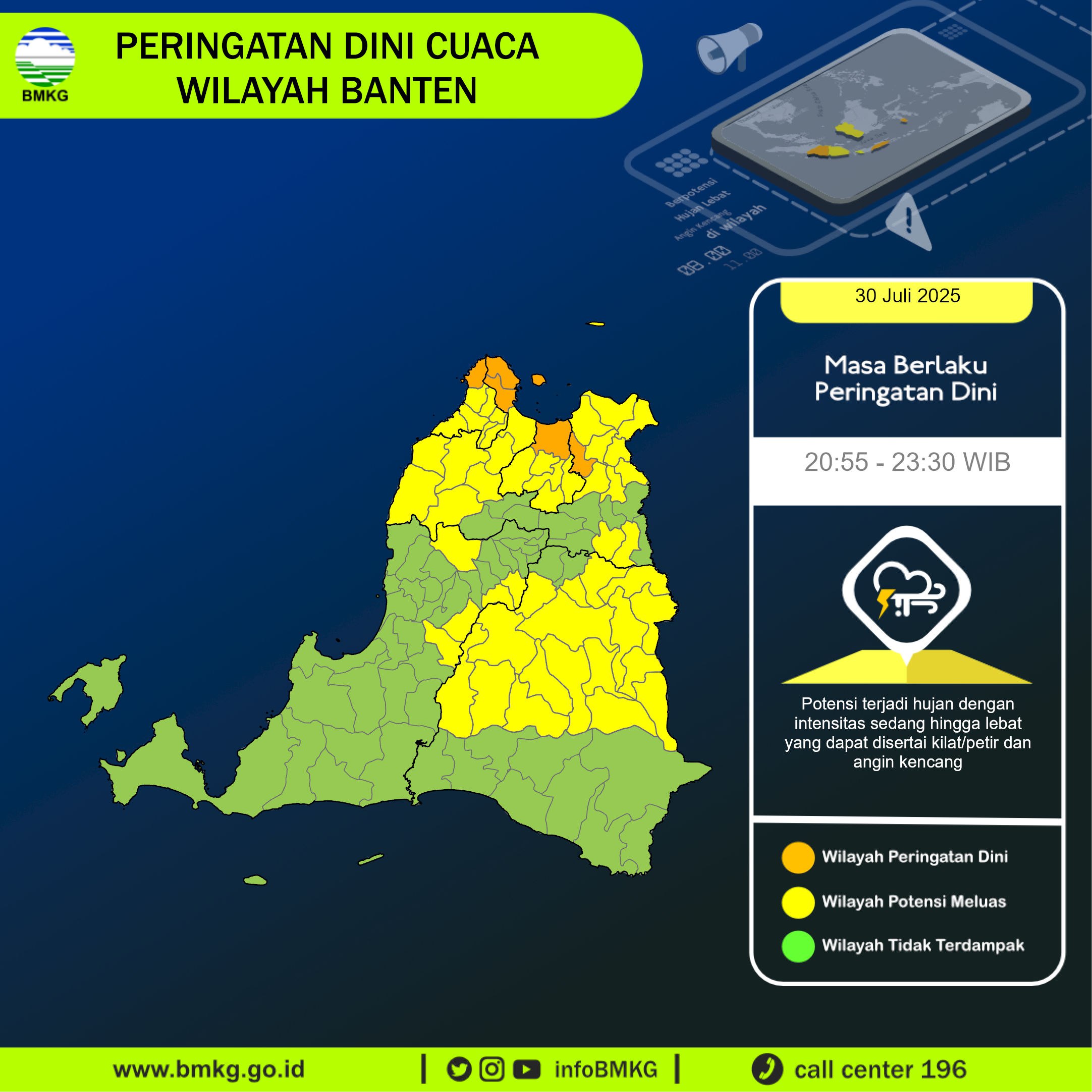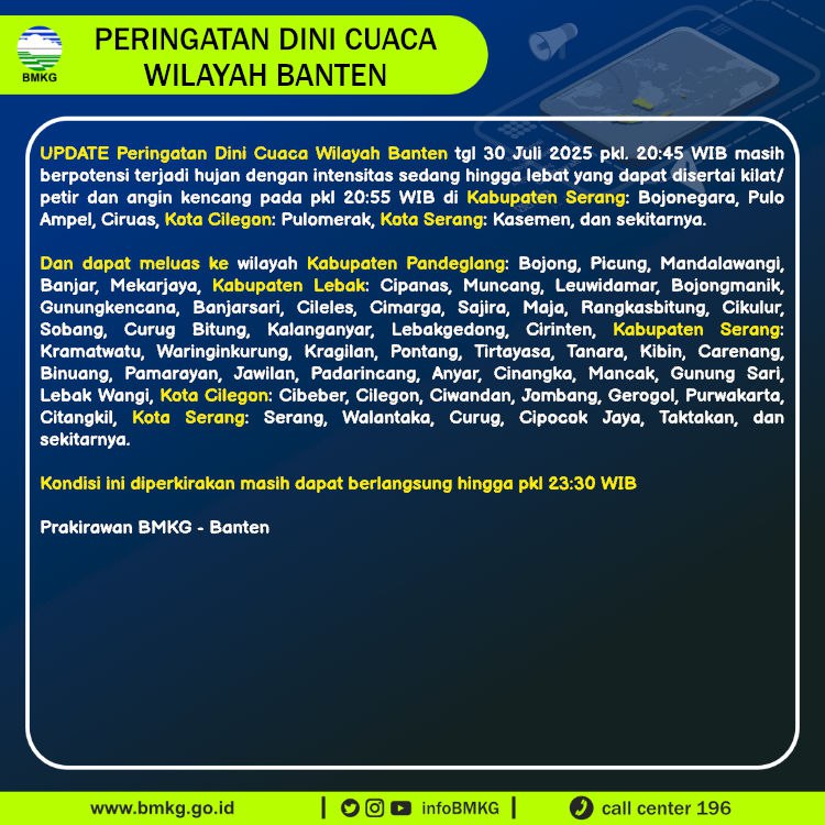 UPDATE Peringatan Dini Cuaca Banten tgl 30 Juli 2025 pkl 20:45 WIB masih berpotensi terjadi Hujan Sedang-Lebat yang dapat disertai Kilat/Petir dan Angin Kencang pada pkl. 20:55 WIB di