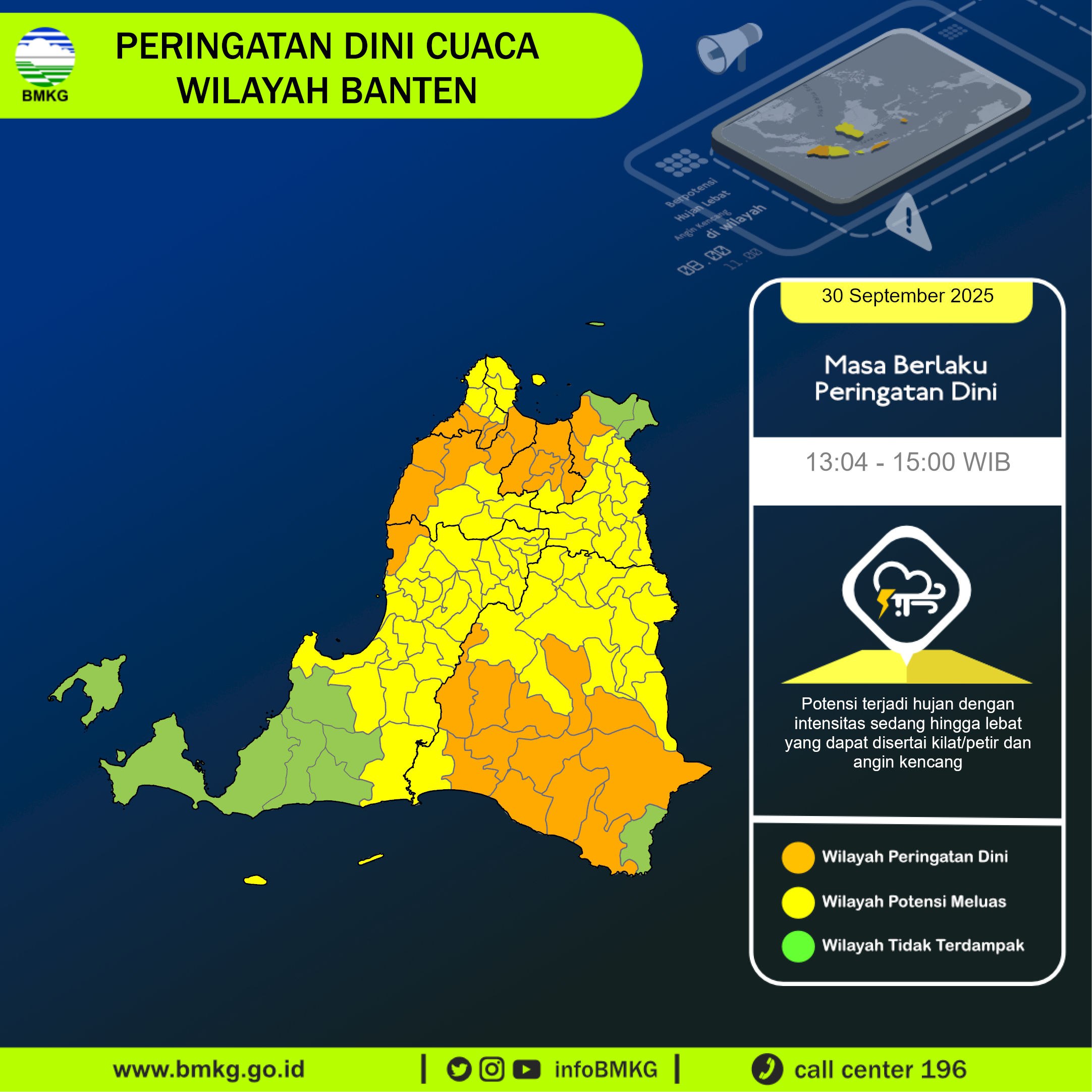 UPDATE Peringatan Dini Cuaca Banten tgl 30 September 2025 pkl 12:54 WIB masih berpotensi terjadi Hujan Sedang-Lebat yang dapat disertai Kilat/Petir dan Angin Kencang pada pkl. 13:04 WIB di