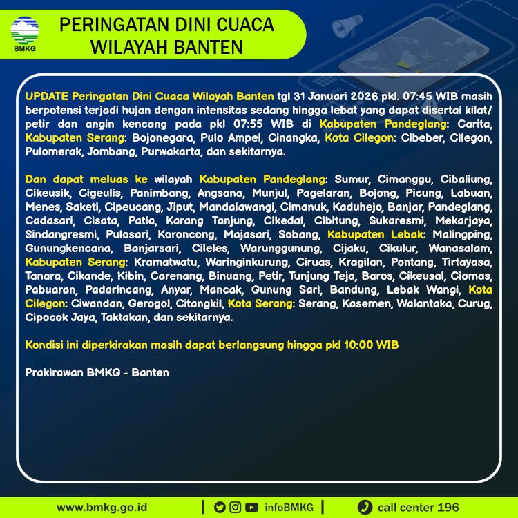 UPDATE Peringatan Dini Cuaca Banten tgl 31 Januari 2026 pkl 07:45 WIB masih berpotensi terjadi Hujan Sedang-Lebat yang dapat disertai Kilat/Petir dan Angin Kencang pada pkl. 07:55 WIB di