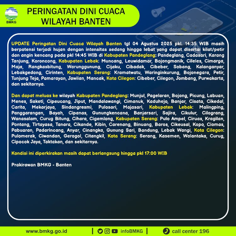 UPDATE Peringatan Dini Cuaca Banten tgl 4 Agustus 2025 pkl 14:35 WIB masih berpotensi terjadi Hujan Sedang-Lebat yang dapat disertai Kilat/Petir dan Angin Kencang pada pkl. 14:45 WIB di