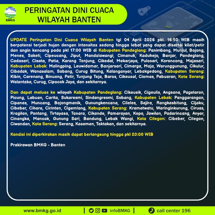 UPDATE Peringatan Dini Cuaca Banten tgl 4 April 2026 pkl 16:50 WIB masih berpotensi terjadi Hujan Sedang-Lebat yang dapat disertai Kilat/Petir dan Angin Kencang pada pkl. 17:00 WIB di