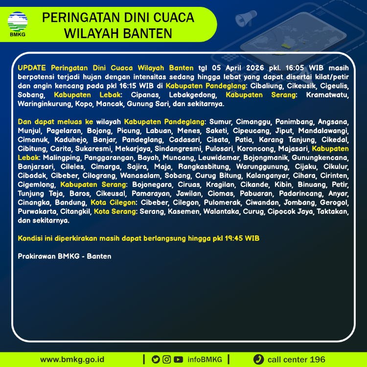 UPDATE Peringatan Dini Cuaca Banten tgl 5 April 2026 pkl 16:05 WIB masih berpotensi terjadi Hujan Sedang-Lebat yang dapat disertai Kilat/Petir dan Angin Kencang pada pkl. 16:15 WIB di