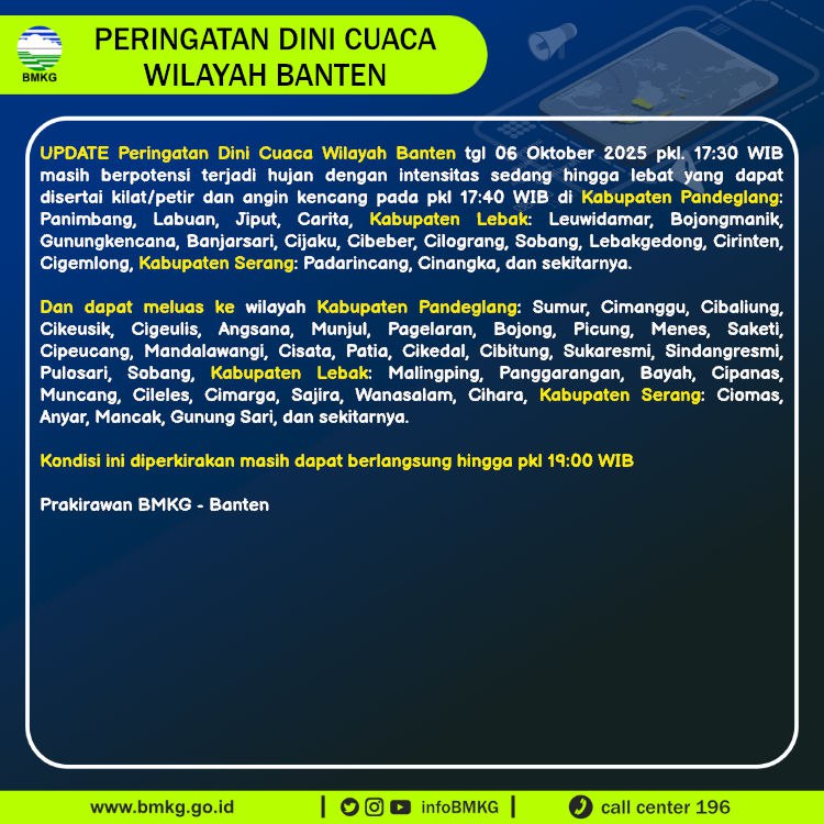 UPDATE Peringatan Dini Cuaca Banten tgl 6 Oktober 2025 pkl 17:30 WIB masih berpotensi terjadi Hujan Sedang-Lebat yang dapat disertai Kilat/Petir dan Angin Kencang pada pkl. 17:40 WIB di