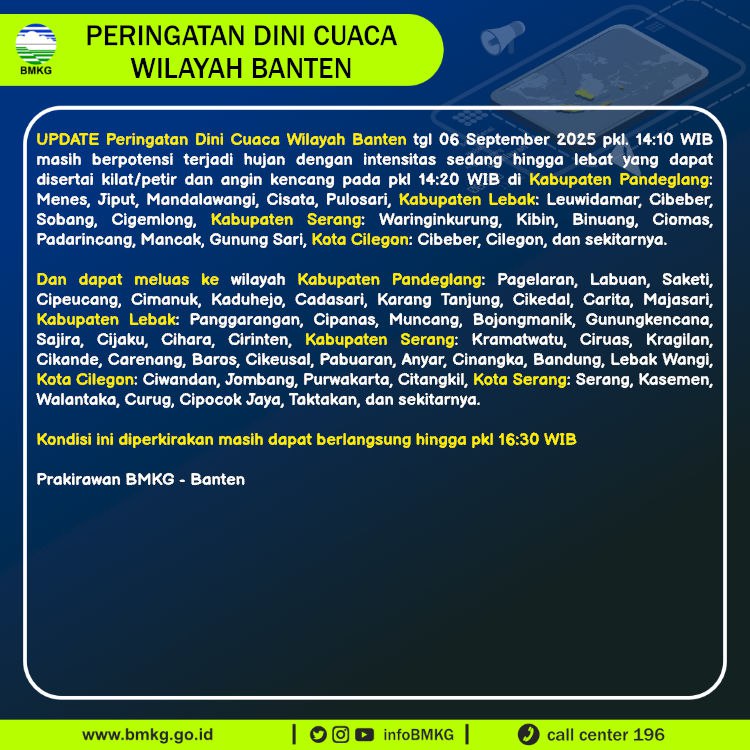 UPDATE Peringatan Dini Cuaca Banten tgl 6 September 2025 pkl 14:10 WIB masih berpotensi terjadi Hujan Sedang-Lebat yang dapat disertai Kilat/Petir dan Angin Kencang pada pkl. 14:20 WIB di