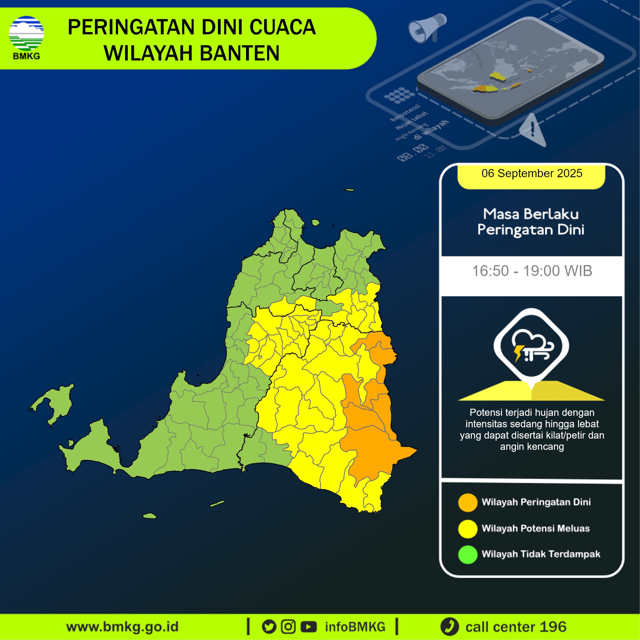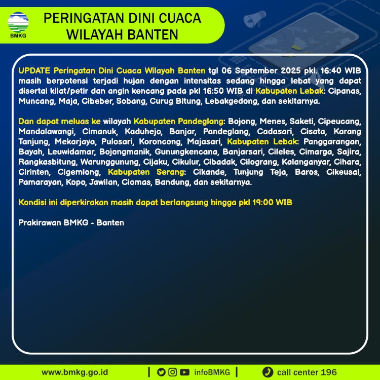 UPDATE Peringatan Dini Cuaca Banten tgl 6 September 2025 pkl 16:40 WIB masih berpotensi terjadi Hujan Sedang-Lebat yang dapat disertai Kilat/Petir dan Angin Kencang pada pkl. 16:50 WIB di